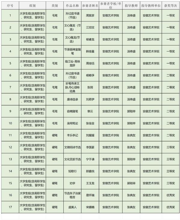 近日,第七届中华经典诵写讲大赛安徽省预选赛评选结果公布。安徽省教育厅组织专家对全省选送的汉字书写大赛作品进行了评审。我校美术学院在本届赛事中表现亮眼,选送的17幅作品(软笔10件、硬笔7件)全部获奖,共斩获一等奖5项、二等奖6项、三等奖4项、优秀奖2项,充分展现了学子们扎实的书法功底和独特的艺术表现力。
