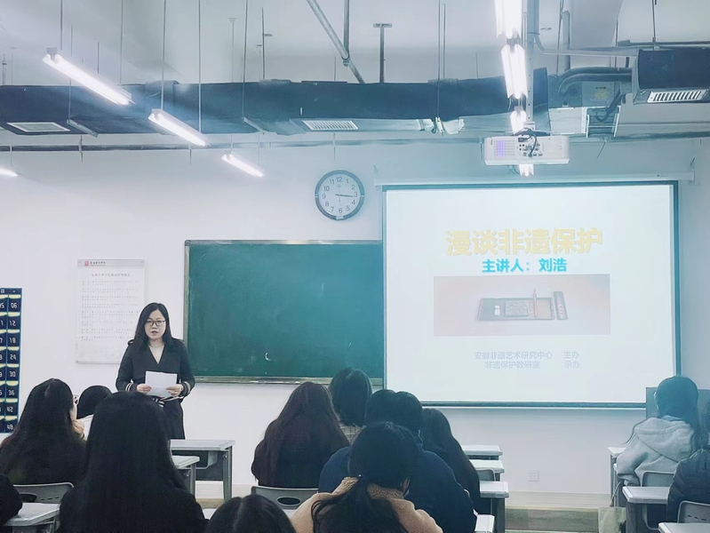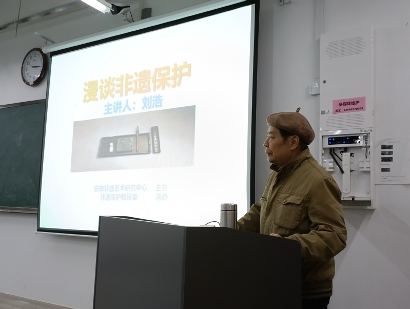 为推动我校“三全育人”工作,11月14日下午,安徽省非遗研究会副秘书长、研究馆员刘浩来中心为非遗保护专业师生开设《漫谈非遗保护》专题讲座。本次讲座由中心主办、非遗保护教研室承办,中心主任杨丽主持讲座。