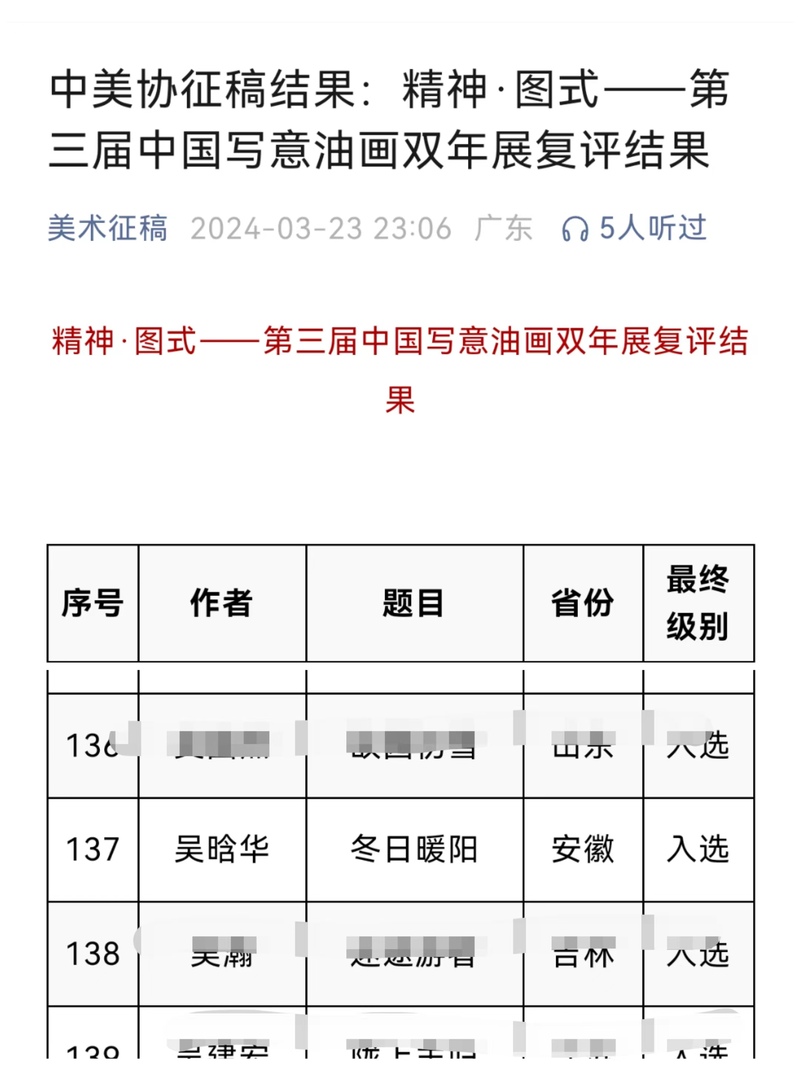 3月23日,从中国美术家协会官网获悉,安徽非遗艺术研究中心副主任吴晗华油画作品《冬日暖阳》入选《精神·图式——第三届中国写意油画双年展》。