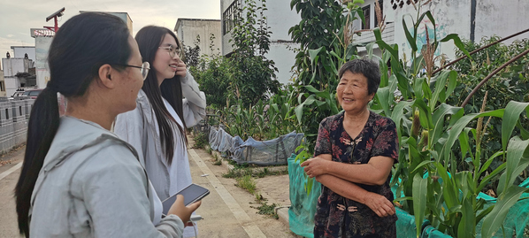庄台边的老人王今桂,看一听来写生的师生来自合肥,连忙回到屋里,端出洗好的新鲜黄瓜给大家解暑。“我家孙女跟你们的年纪差不多大,也在合肥上大学……”师生们同王今桂老人拉起了家常,有说有笑。
