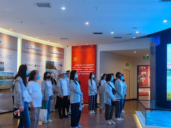 王家坝抗洪纪念馆展厅内,小分队成员们认真听取馆内讲解员的讲解,了解淮河流域的深厚历史和王家坝人民的抗洪经历,聆听淮河两岸的民生故事。