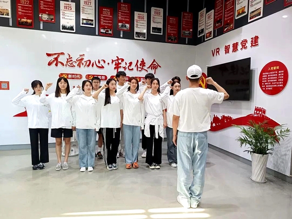 这里建有全国第一批、安徽省第一所VR智慧党建馆。同学们在带队老师孔晓欣的带领下一起重温入党誓词。