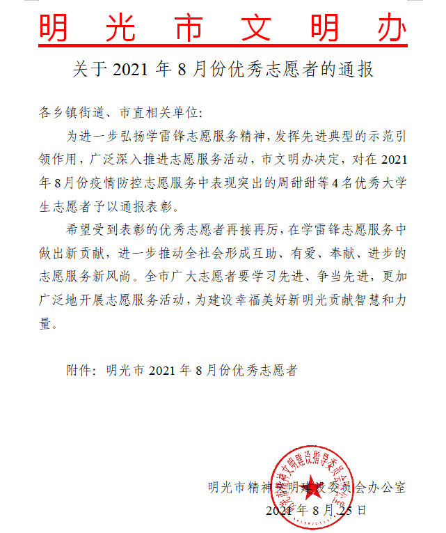 8月31日,安徽省明光市三界镇人民政府通报表彰了我系学子周甜甜,以鼓励周甜甜在暑期疫情防控志愿服务期间的优异表现。