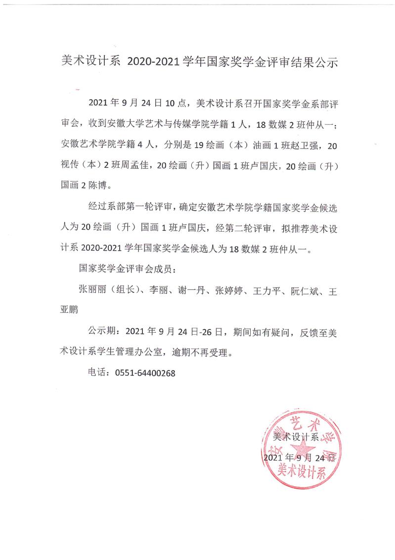 美术设计系 2020-2021学年国家奖学金评审结果公示