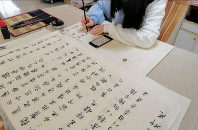 张成龙同学表示,寒假期间,为提高自己的思想素质和专业能力,在家中临古摹今,努力提升自己;李煜同学也在家进行书法学习,用铁