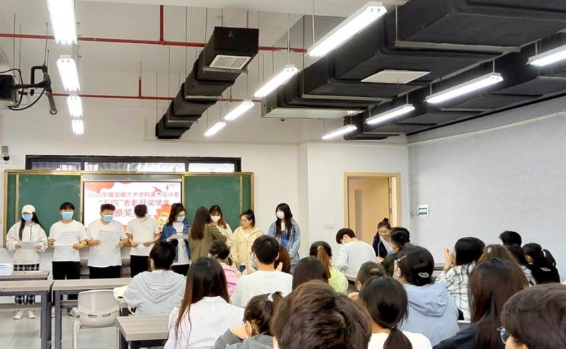 此次活动分为三项内容:“献礼党的二十大、把青春唱给你听”歌唱比赛奖、2022年度新葡的京集团3512vip美术设计系“五四”表彰奖和2022年寒假大学生社会实践活动奖。活动最后,获奖同学依次和老师拍照留念。