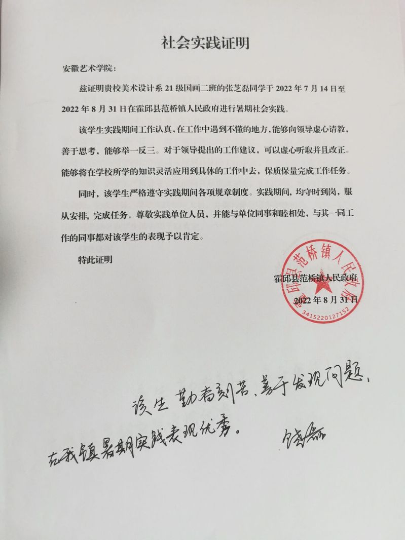 今年暑期,美术学院2021级国画二班张芝磊报名了霍邱县“返家乡”大学生社会实践活动。他走进基层政府为助力乡村振兴,为自己的家乡振兴而奋斗。他穿着大红马甲,顶着烈日高温,跟随基层干部参加下乡调研、预防溺水巡查、慰问困难群众,疫情防控值班等工作。