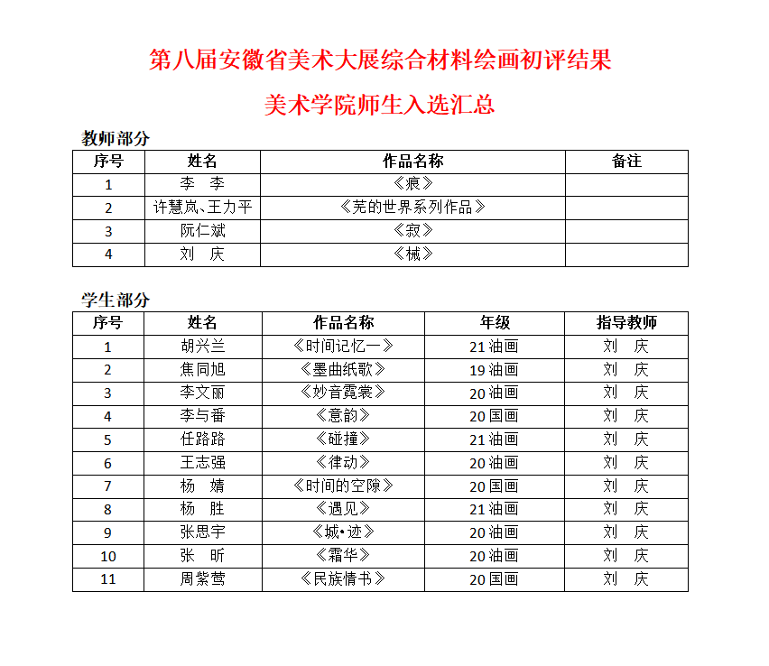 10月26日,“第八届安徽美术大展综合材料作品展”公布了初评名单,美术学院通过初评师生共计十余名。具体名单如下: