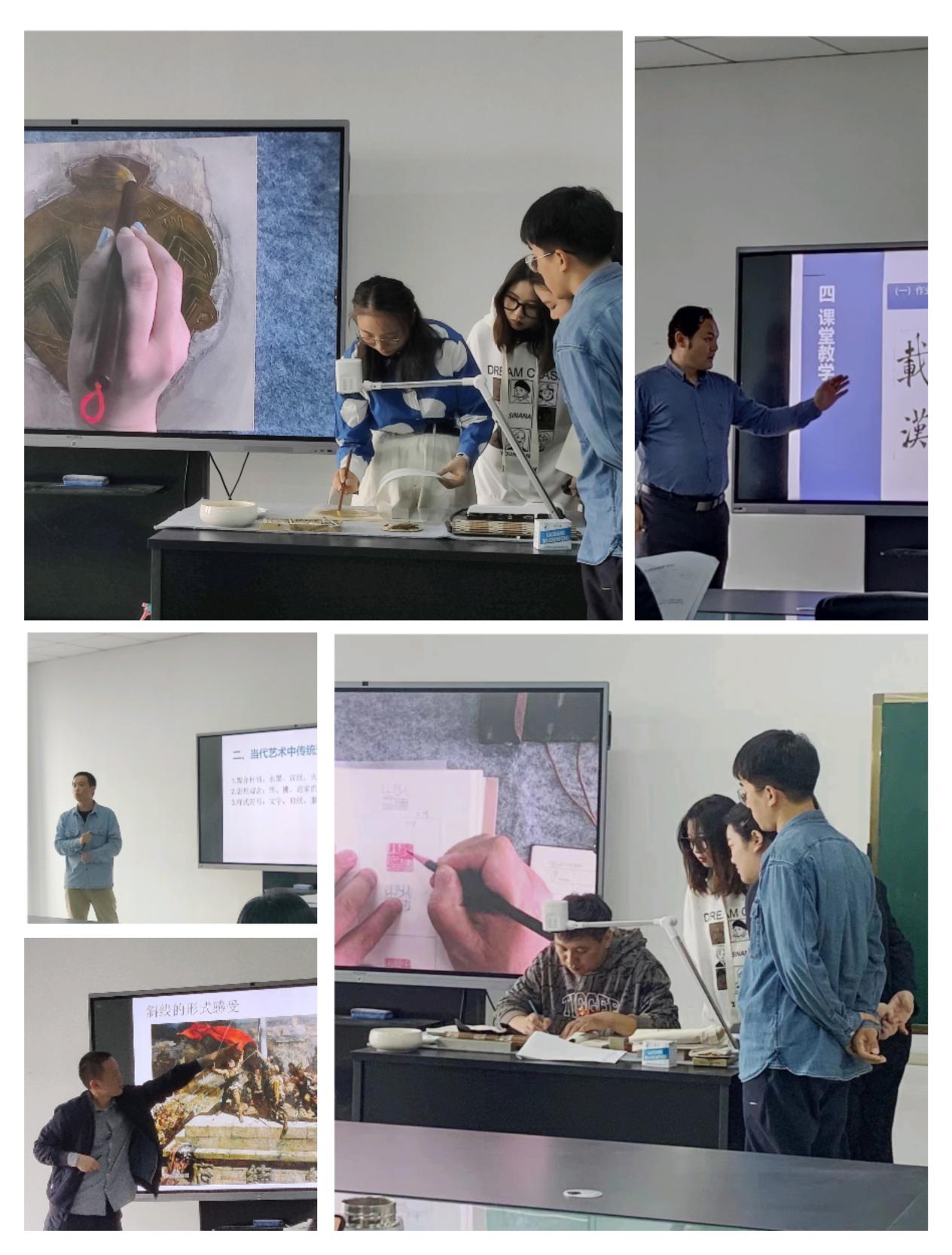 本次大赛有书法、篆刻、版画、油画,综合材料绘画五个专业方向,五位选手按照赛前的抽签顺序依次上台,从教学设计、说课、课堂教学三个环节进行展示。
