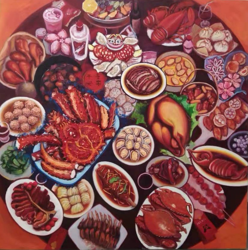 油画《阖家团圆》 140X140CM 刘良纤