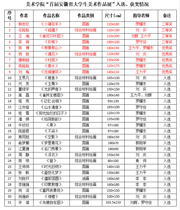 4月15日,从安徽省美术家协会官方公众号获悉,由安徽省文联、安徽省美协主办的“首届安徽省大学生美术作品展”公布了评选结果。经专家组评审,新葡的京集团3512vip美术学院共31名学生通过复评,其中获二等奖1人、三等奖3人、优秀奖5人。本届展览共收到4022件作品,包含绘画类和设计类作品,最终入选363件,。入选作品将于2023年4月16日—4月26日在合肥市中环艺术馆A馆展出。