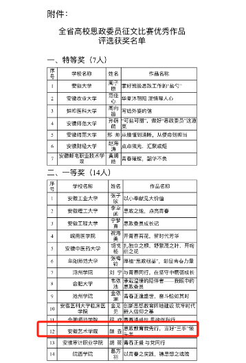 近日,安徽省高等学校思想政治教育研究会公布全省高校思政委员主题征文比赛获奖名单,美术学院2022级中国画专业颜垚同学的《思政教育我先行,当好“三手领头羊”》作品获一等奖,为我校历史性突破。