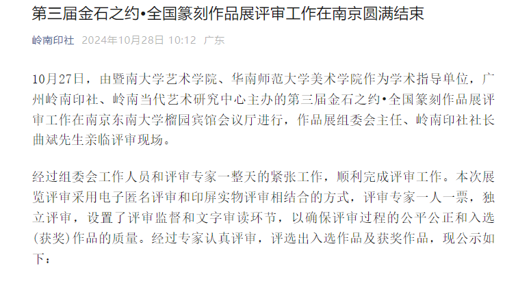 第三届金石之约•全国篆刻作品展由暨南大学艺术学院、华南师范大学美术学院作为学术指导单位,广州岭南印社、岭南当代艺术研究中心主办。