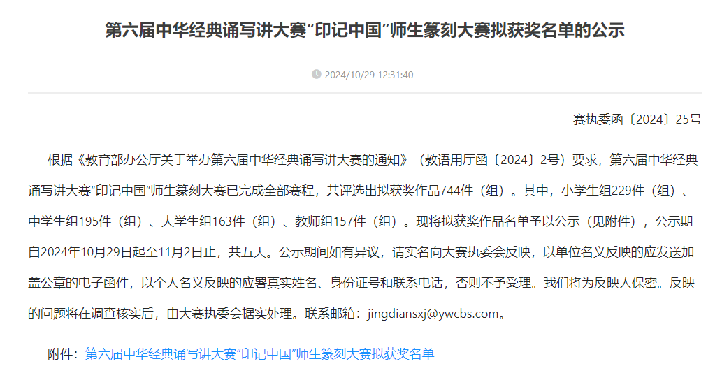 中华经典诵写讲大赛是教育部、国家语委主办的公益性、全国性赛事活动,每年举办一届。为贯彻落实党的二十大精神和习近平文化思想,2024年,教育部、国家语委举办第六届中华经典诵写讲大赛,包括“诵读中国”经典诵读大赛、“诗教中国”诗词讲解大赛、“笔墨中国”汉字书写大赛和“印记中国”师生篆刻大赛四个赛项。