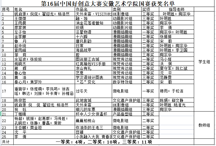 国赛一等奖:4项,二等奖:10项,三等奖:11项;