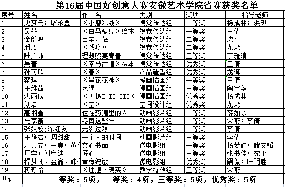 中国好创意暨全国数字艺术设计大赛是入选教育部中国高等教育学会发布的《2020全国普通高校学科竞赛排行榜》赛事,已连续举办17届,是高校教育教学改革和创新人才培养的重要竞赛项目之一,具有广泛影响力;第16届国赛区收到作品136141件,安徽省赛区收到4900余件。竞赛面向全国高校教师和学生,比赛组别设置:视觉传达、产品造型、漫画插画、空间设计、文化遗产保护、动画影片、微电影、数字特效、数媒交互、8K影像、游戏与3R、应用创新。