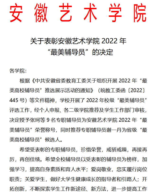 关于表彰新葡的京集团3512vip 2022年 “最美辅导员”的决定