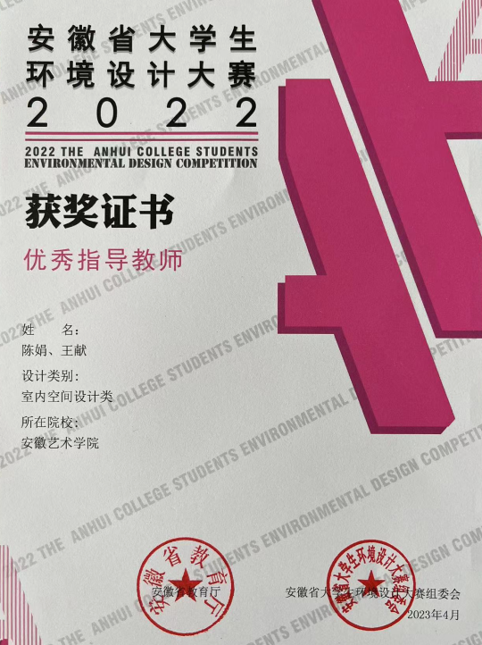 近日,由安徽省教育厅主办,安徽工程大学承办的2022年安徽省大学生环境设计大展公布获奖情况。我院陈娟、王献、魏曼云等教师所指导的学生斩获佳绩。其中马蝶蝶、尹紫凝等同学取得了包括一、二等奖在内的奖项。大赛主委会授予陈娟、王献为优秀指导教师称号。