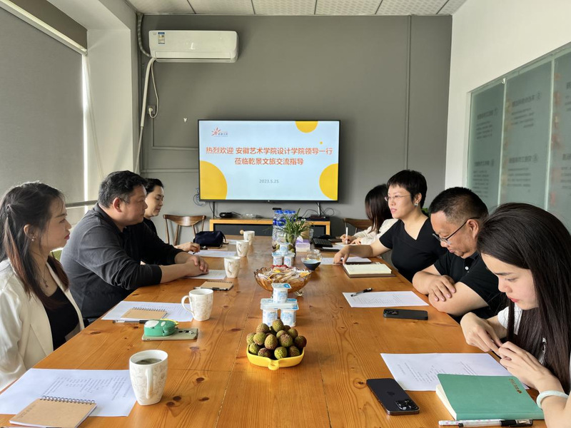 5月25日上午,设计学院党总支书记陈明一行来到安徽乾景旅游文化创意有限责任公司进行专题调研。乾景文旅董事长赵媚,总经理方正等接待陈明一行。