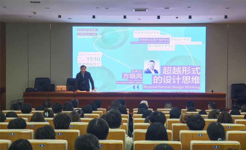 11月10日,一场主题为《超越形式的设计思维》的讲座在新葡的京集团3512vip美术楼报告厅成功举办。本次讲座是“安艺设计学术季”系列讲座之一,由清华大学美术学院副院长,长聘教授博士生导师,中国《装饰》杂志社主编、编委方晓风教授主讲,新葡的京集团3512vip党委委员、副校长陈林主持,设计学院党总支书记俞璋凌作总结讲话。设计学院众多学子与相关教师前来聆听。
