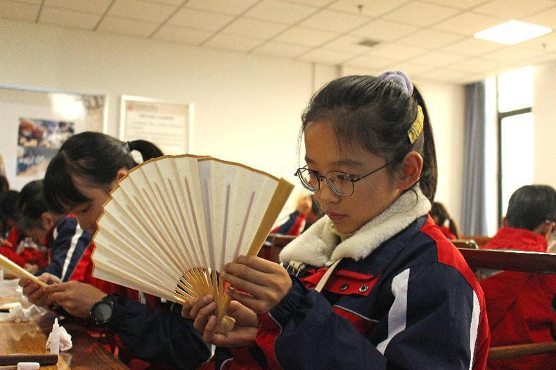 小学生们在老师的讲解下,了解了传统制扇工艺的相关知识,从扇子的起源与发展,到种类与特色,配合实物展示,学生们直观感受了扇骨选材、扇面绘制等制作工艺的魅力。