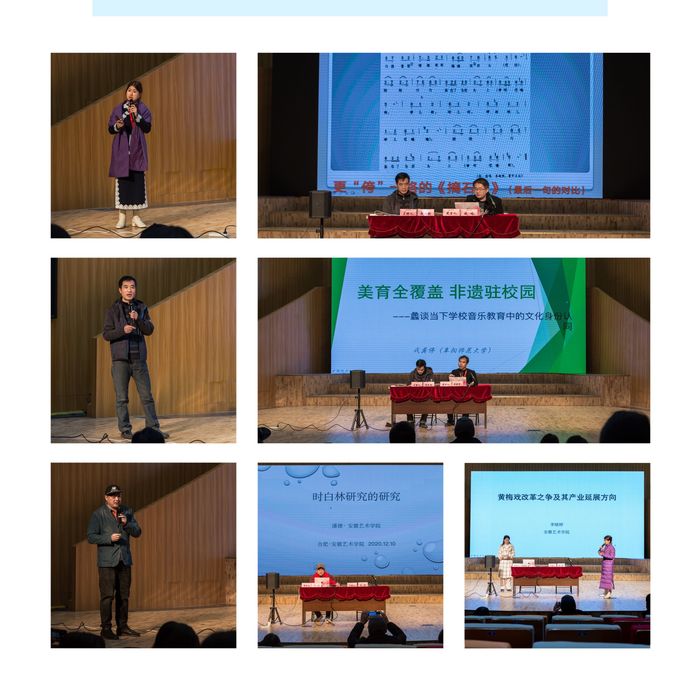 本次论坛还精心组织了“皖风徽韵”开幕式音乐会。音乐会上半场,国家级“非遗”巢湖民歌传承人李家莲演唱了《新打的小船亮光光》《含秧歌》,国家级“非遗” 大别山民歌传承人余述凡演唱《慢赶牛·郎在高山唱山歌》《十二月花名》等曲目。两位传承人精湛的技艺和独特的艺术韵味赢得了在场观众的阵阵惊叹和掌声。由安徽省泗州戏剧院带来的国家级“非遗”泗州戏选段《走娘家》《小二姐作梦》,旋律优美动听、动作飘逸灵动,别有一番风味。下半场由李传兴执棒我院青年国乐团演奏了《凤阳歌》《黄梅调随想》《琅琊神韵》《兰花舞》《阡陌之花》等5首安徽风格的民族管弦乐作品。5首作品风格迥异、特征明显,青年国乐团也将5部作品演绎的淋漓尽致、收放自如,观众们充分领略到了安徽音乐的魅力。